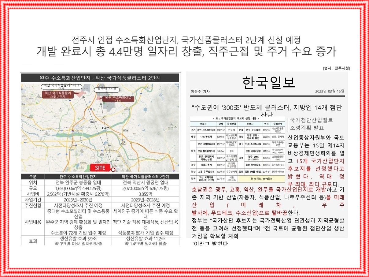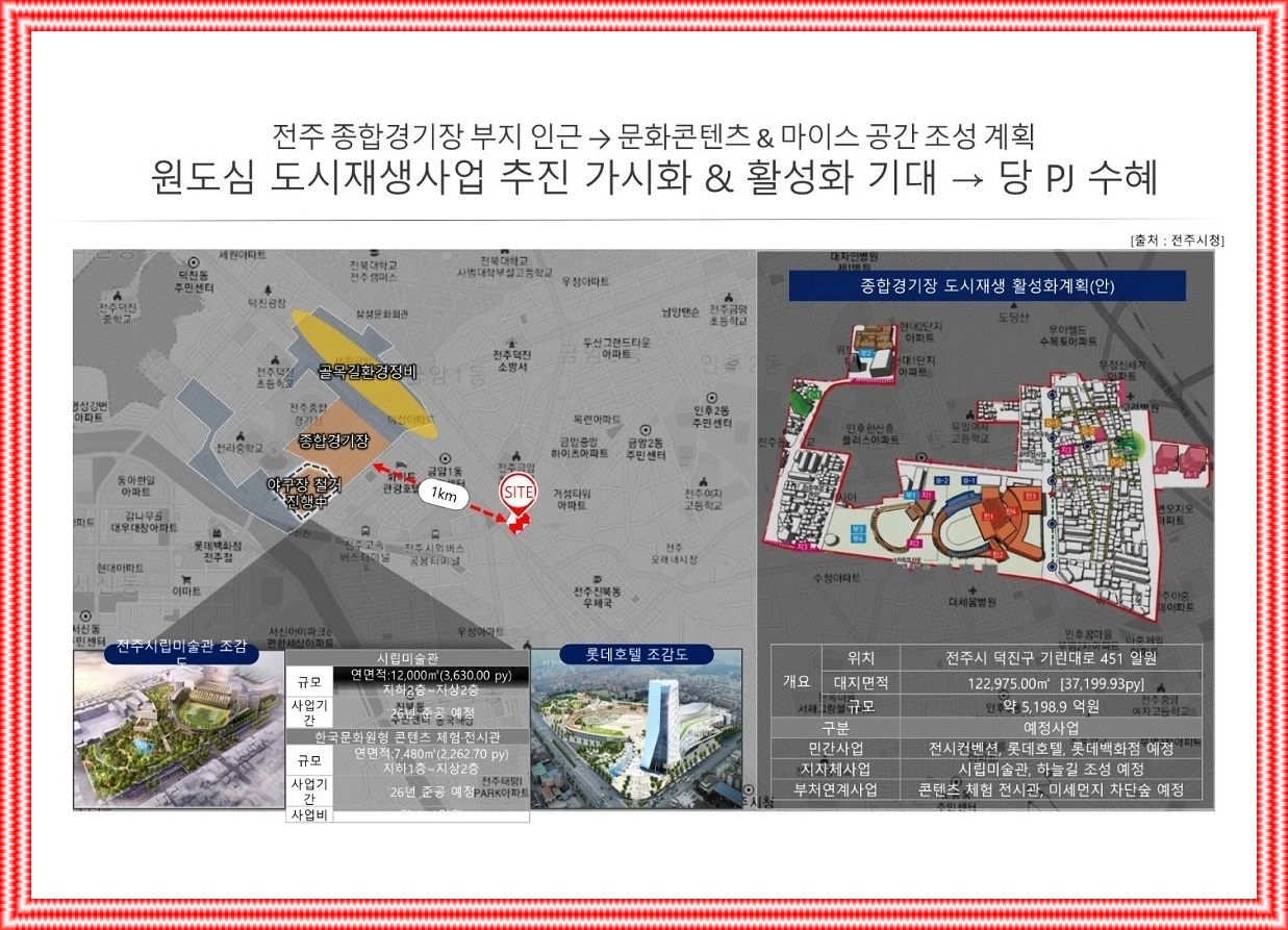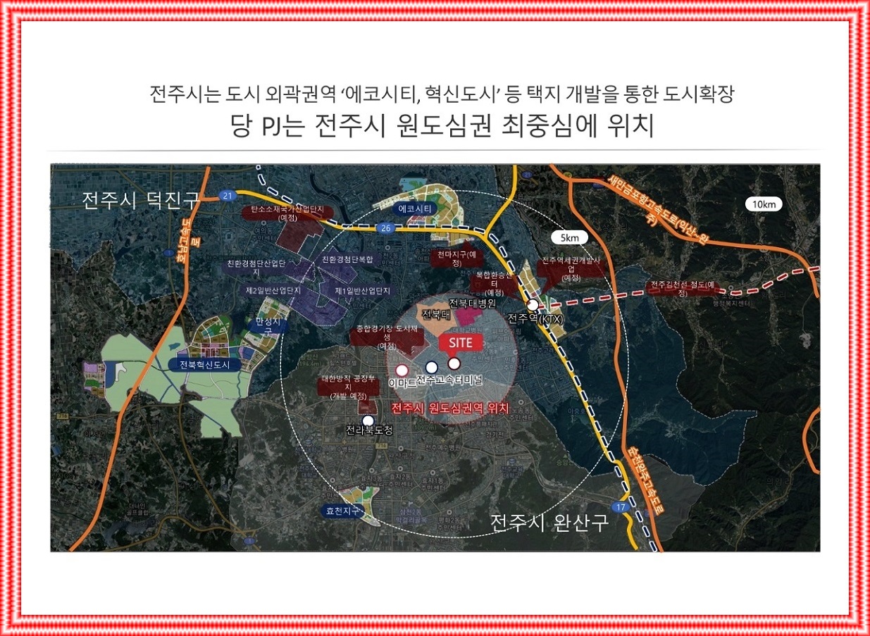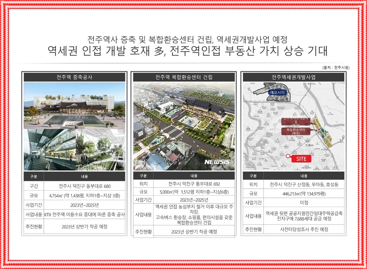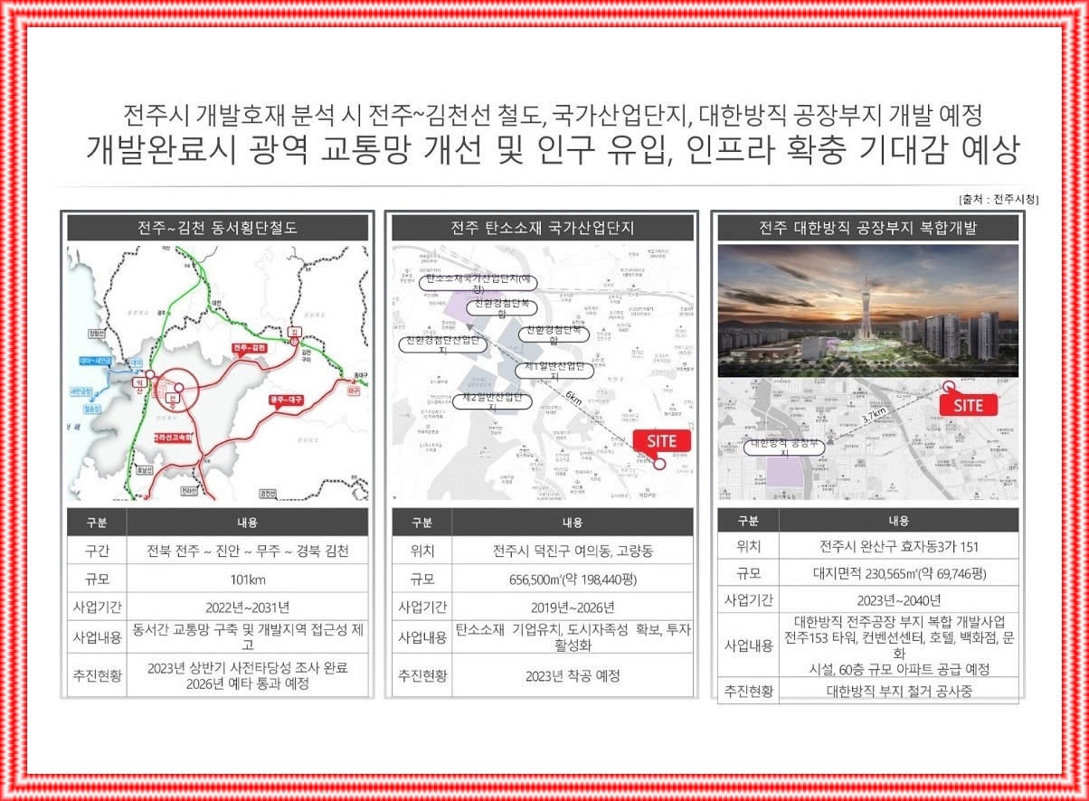 전주에코시티 외곽⚬혁신도시 등 주거단지 개발, 원도심 도시재생사업 가시화⚬활성화하다, 전주종합운동장 부지, 시민의 숲 및 백화점⚬호텔⚬컨벤션센터 등 문화콘텐츠⚬MICE 룸 레이아웃 계획, 법원⚬검찰청 홈페이지 한국문화원형 콘텐츠 체험⚬건설 프로젝트 전시관( 예상되는), 전주~김천선 철도, 국가산업단지, 대한섬유공장 부지조성(예상되는), 전주역 확장⚬복합환승센터⚬역세권 개발 등 개발 기회가 많다.