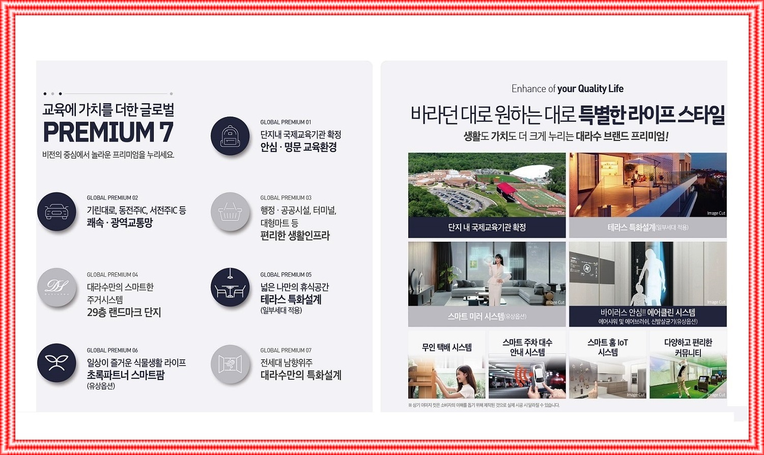 똑똑한 집사물 인터넷 체계, 지능형 미러 시스템(유료 옵션), 에어샤워⚬에어 브러시⚬신발 살균기(유료 옵션) 바이러스 방지 공기 정화 시스템, 지능형 주차번호 안내 시스템, 무인배송시스템, 외부인의 출입을 철저히 통제하는 최첨단 보안 및 방범 시스템을 적용하여 안전한 생활을 보장합니다..