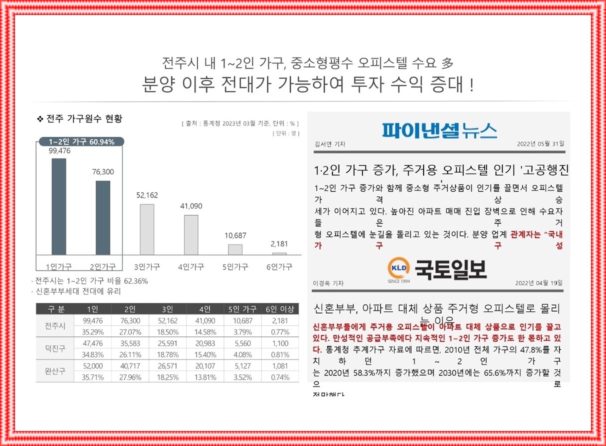 전주곡하나⚬2일반산업단지, 친환경 첨단단지 전주, 완주 수소특화산업단지, 익산국가식품클러스터 2단계를 포함한 여러 산업 단지, 국립전북대학교, 전북대학교병원, 재정가, 전북은행 본점처럼 풍부한 배경 수요를 가지고 있습니다..