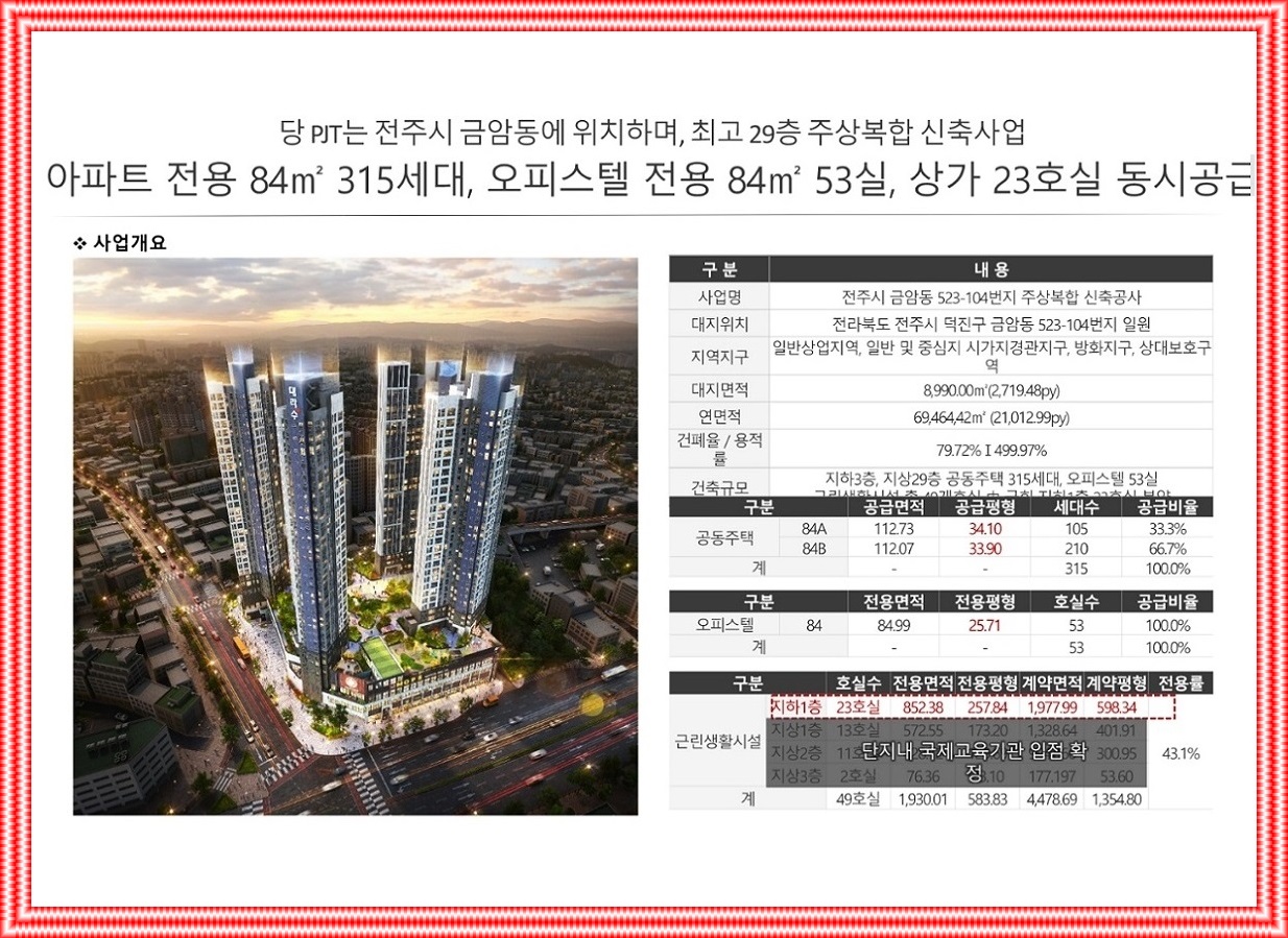 전주시 금암동 523-104전라북도 전주시 덕진구 금암동 번지주상복힙신개발 523-104분지지역 일반상업지역, 일반 및 중앙 도시 풍경구, 소방 지구, 상대방의 보호 구역에 있는 그라운드삼바닥~바닥에29바닥 규모의 구성(예상되는)그리고 아파트 건물(아파트) 315세대, 사무실 전화 53선, 상업시설 23객실로 구성(예상되는)것이 가능하다.