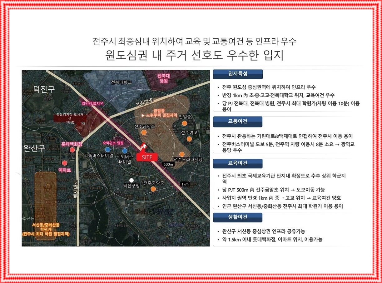 롯데백화점 전주점, 이마트, 롯데마트, 홈플러스, 모래 시장, 대학로 업무지구, 전주시청, 덕진구청, 골드 락2동주민센터, 전주 덕진소방서, 전라북도 전주교육청, 전주금암2우체국 동쪽, 전북대학교병원, 예수병원, 원광한방병원, 전주종합운동장 등 활기찬 인프라를 편리하게 즐기실 수 있습니다..