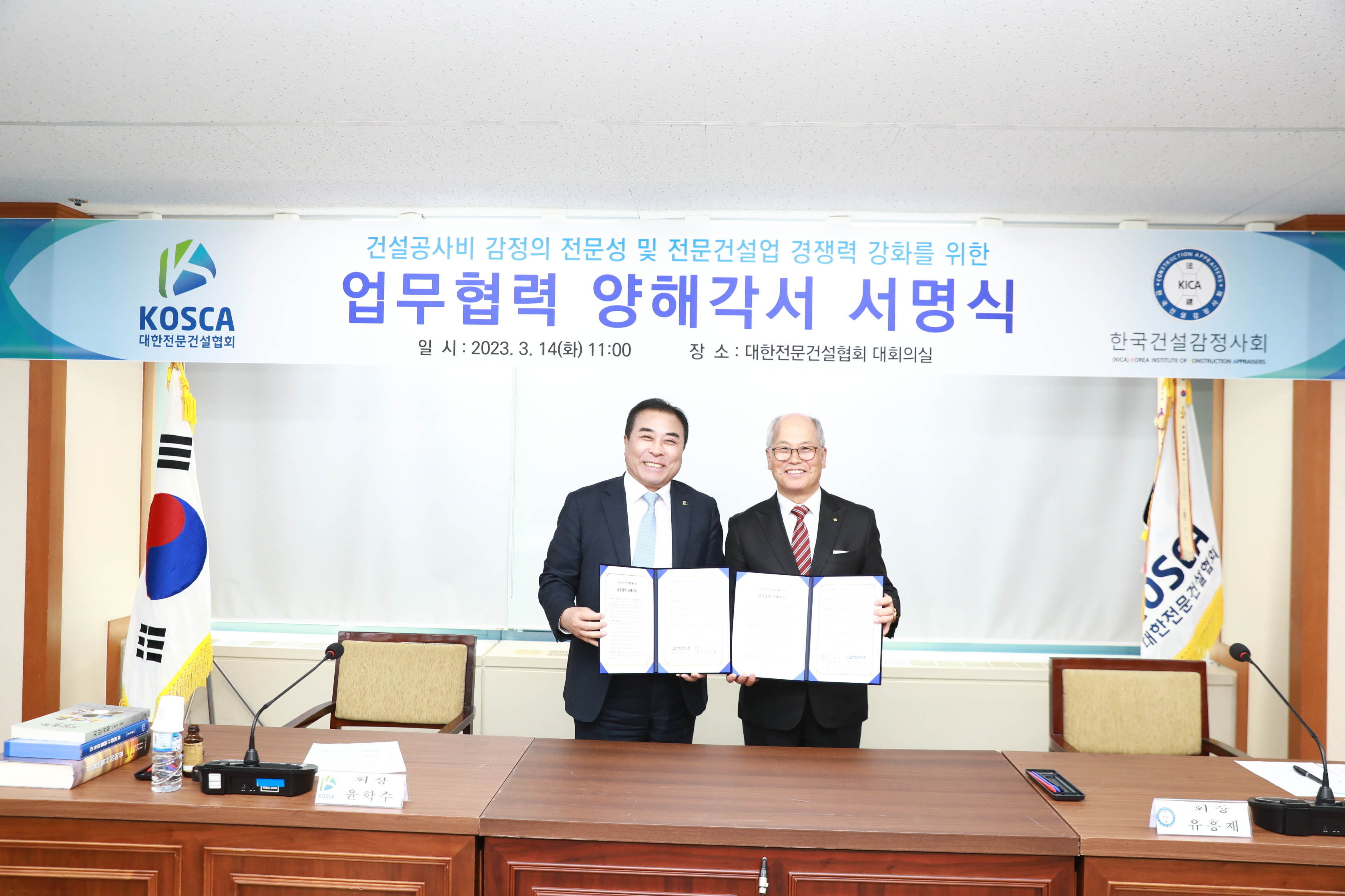 윤학수 전문건설협회 회장과 유흥재 감정평가학회 회장은 공사비의 전문성과 객관성을 높여 전문건설업 발전에 기여하기 위한 협력 필요성에 공감하고 의결했다. 긴밀하고 신뢰하는 협력을 위해.