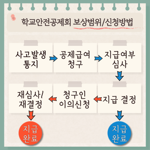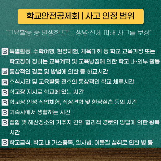 학교안전공제회 학교안전사고보상지원시스템 「학교안전사고 예방 및 보상에 관한 법률」에 따라 학생·교직원 및 교육활동 참가자가 학교안전사고로 인하여 입은 피해보상을 지원 www.schoolsafe.or.kr